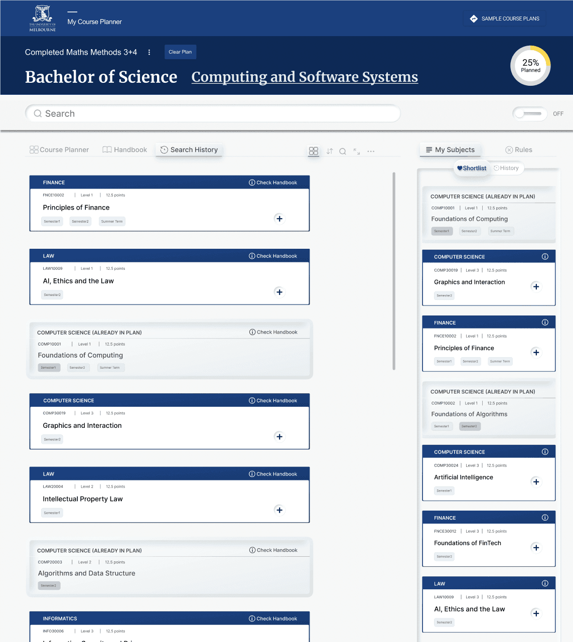 The University of Melbourne’s Course Planner and Handbook are essential tools used by tens of thousands of students to explore subjects, plan degrees, and make enrolment decisions. While widely used, the platform had accumulated usability issues over time, making it difficult for students to efficiently find, compare, and organise course information.